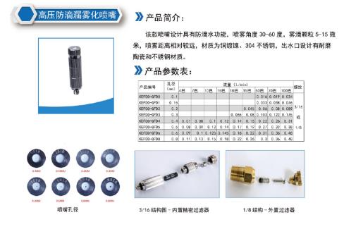 噴嘴選用:選用導流片式噴嘴,內置精密過濾器,噴霧霧滴細小5-15um,工作壓力40-80公斤,流量60ml/min